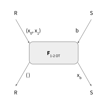 In 1-2 oblivious transfer there are two parties: the sender $S$ and the receiver $R$. The sender has as input two values: $x_0$, $x_1$. The receiver has as input a choice bit: $b \in \{0, 1\}$. The sender receives no output, the receiver receives $x_b$, one of the two values according to its choice bit. A secure 1-2 OT instance should not reveal any information to the sender, in particular the sender should not learn anything about the choice bit of the receiver. Similarly, the receiver should learn nothing about the other value $x_{b-1}$. This is depicted in Figure 1.