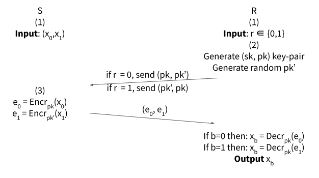 - If $b = 1$ then $R$ decrypts $e_1$ with $pk$: $x_b = Decr_{pk}(e_1)$.