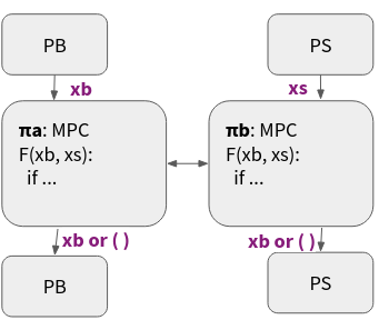 - Independence of inputs: $PB$ should not be able to chose its inputs to the auction based on $PS$’s inputs, for example $PB$ could choose $xb = xs$, we don’t want this to be possible.