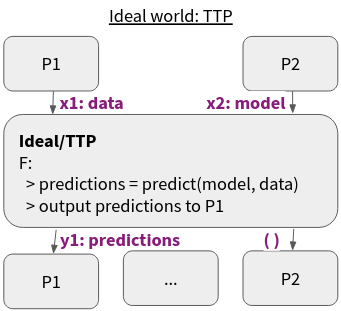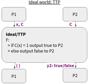 In the way we described this, the TTP can be modeled as a trusted (or as we also call it, ideal) functionality, that computes a function with inputs from the parties and outputs to the parties. What about the security of using a TTP? By definition, the TTP can be trusted to a fault, it is incorruptible. This, however, is somewhat idealistic. In the real world there may not be any TTP, there is plenty of evidence of corruption in cases when a TTP would act in malicious ways. But, is there a better way of doing these things? Perhaps. Secure multiparty computation (MPC) is a technique for replacing a TTP with a secure protocol that involves the same parties, but does not involve a TTP. We will delve deeper into this later on, but we will call this that the MPC protocol securely realizes, or emulates, or implements, the TTP ideal functionality.