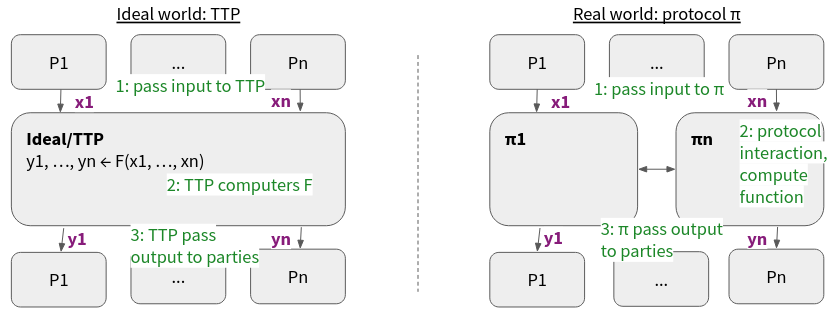 In the ideal world, there exists a trusted third party (TTP), also referred to as the “ideal functionality” F, that computes the function for the parties. In the real world, no such TTP exists, but the parties instead invoke a protocol $\pi$ that computes this function.